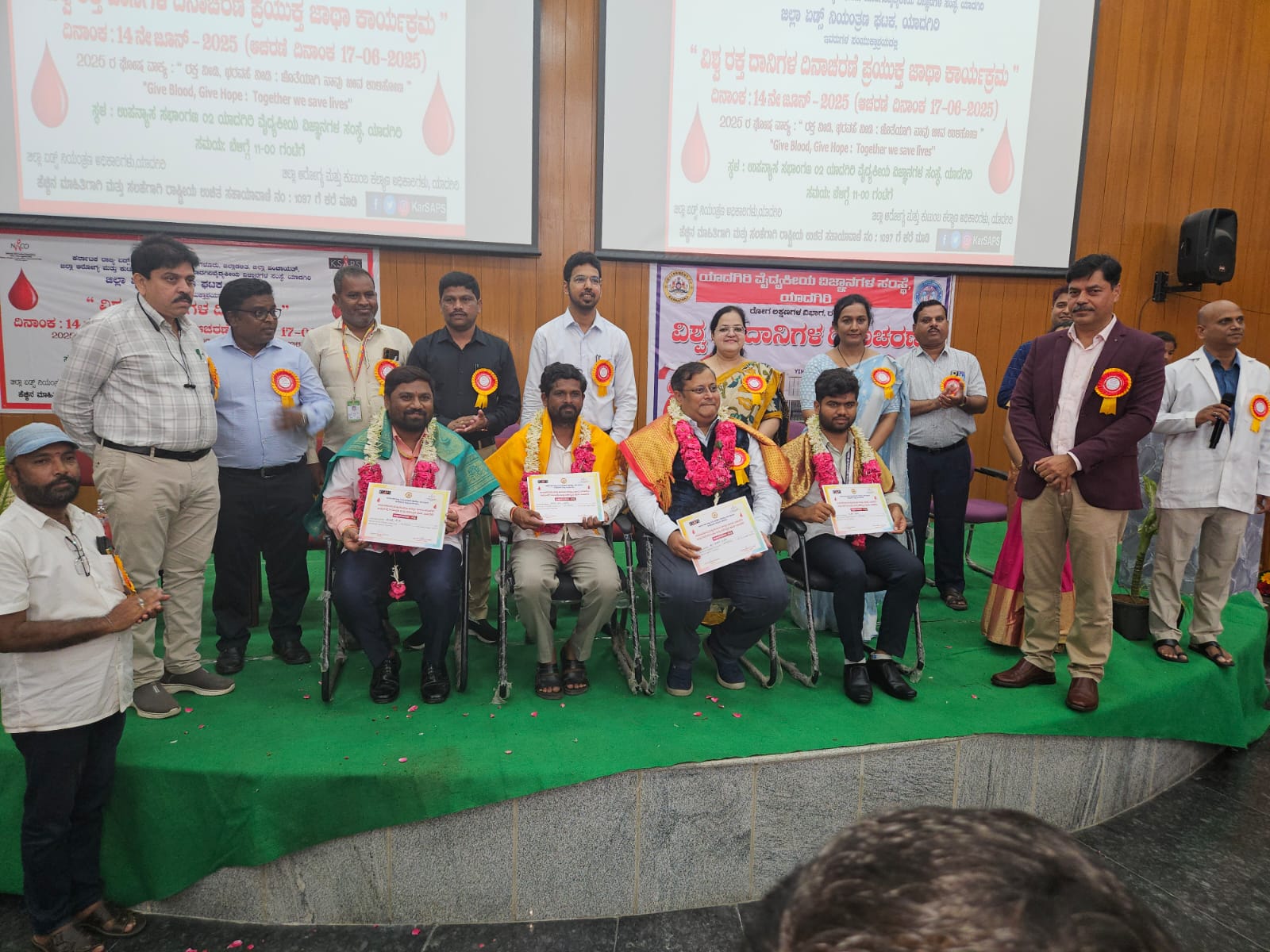 ಕಾರ್ಯಕ್ರಮದಲ್ಲಿ ಅತಿ ಹೆಚ್ಚು ಬಾರಿ ರಕ್ತದಾನ ಮಾಡಿದ ದಾನಿಗಳಾದ ಯಿಮ್ಸ್ ನಿರ್ದೇಶಕರು ಡಾ.ಸಂದೀಪ.ಹೆಚ್ ಅವರು ಶ್ರೀ ನಿಂಗಪ್ಪ ಜಡಿ, ಅಭಿಲಾಷ ಮತ್ತು ಸುಪ್ರೀತ ಇವರಿಗೆ ಸನ್ಮಾನಿಸಿ ಪ್ರಶಸ್ತಿ ಪತ್ರ ನೀಡಲಾಯಿತು ಹಾಗೂ ವೈದ್ಯಕೀಯ ವಿದ್ಯಾರ್ಥಿಗಳು ಮತ್ತು ಸಿಬ್ಬಂದಿ ವತಿಯಿಂದ ರಕ್ತದಾನ ಶಿಬಿರದಲ್ಲಿ 34 ಜನ ರಕ್ತದಾನ ಮಾಡಲಾಯಿತು.