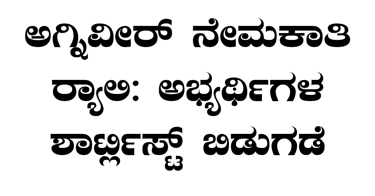 ಯಾದಗಿರಿ: ಬೆಳಗಾವಿಯ ಸೇನಾ ನೇಮಕಾತಿ ಕಚೇರಿಯಿಂದ ಅಗ್ನಿವೀರ್ ನೇಮಕಾತಿ ರ್ಯಾಲಿಯು ರಾಯಚೂರಿನ ಕೃಷಿ ವಿಜ್ಞಾನಗಳ ವಿಶ್ವವಿದ್ಯಾಲಯದ ಆವರಣದಲ್ಲಿ ಆಗಸ್ಟ್ 08 ರಿಂದ ಆಗಸ್ಟ್ 25ರವರೆಗೆ ನಡೆಯಲಿದ್ದು, ರ್ಯಾಲಿಯಲ್ಲಿ ಭಾಗವಹಿಸುವ ಅಭ್ಯರ್ಥಿಗಳ ಶಾರ್ಟ್ಲಿಸ್ಟ್ ಬಿಡುಗಡೆ ಮಾಡಲಾಗಿದೆ.