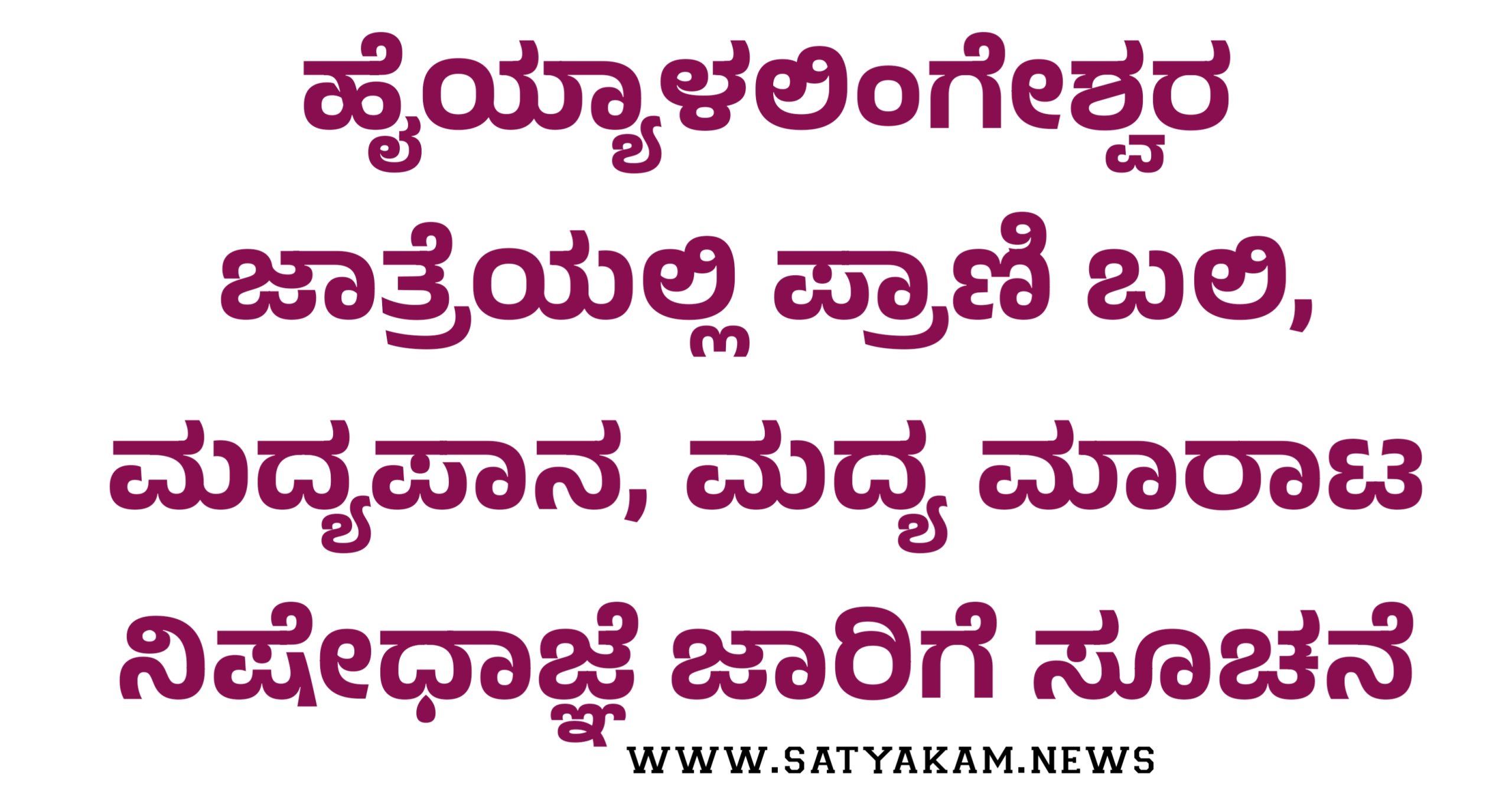 ಕರ್ನಾಟಕ ಜಾನುವಾರು ಹತ್ಯೆ ಪ್ರತಿಬಂಧಕ ಮತ್ತು ಸಂರಕ್ಷಣಾ ಅಧಿನಿಯಮ 2020ರ ಹಾಗೂ ಕರ್ನಾಟಕ ಅಬಕಾರಿ ಕಾಯ್ದೆ 1965ರ ಕಲಂ 21ರ ಪ್ರಕಾರ ಪ್ರದತ್ತವಾದ ಅಧಿಕಾರವನ್ನು ಚಲಾಯಿಸಿ, ವಡಗೇರಾ ತಾಲ್ಲೂಕಿನ ಹೈಯ್ಯಾಳ (ಬಿ) ಗ್ರಾಮದಲ್ಲಿ 2025ರ ಆಗಸ್ಟ್ 9 ರಿಂದ 13ರ ವರೆಗೆ ನಡೆಯಲಿರುವ ಶ್ರೀ ಹೈಯ್ಯಾಳಲಿಂಗೇಶ್ವರ ಜಾತ್ರೆಯಲ್ಲಿ ದೇವರ ಹೆಸರಲ್ಲಿ ಪ್ರಾಣಿ ಬಲಿ ಅಂದರೆ ಕುರಿ ಮತ್ತು ಕೋಣ ಬಲಿ ಕೊಡುವುದನ್ನು 2025ರ ಆಗಸ್ಟ್ 9 ರಿಂದ 13ರ ವರೆಗೆ ಶ್ರೀ ಹೈಯ್ಯಾಳಲಿಂಗೇಶ್ವರ ದೇವಸ್ಥಾನದ 5 ಕಿ.ಮೀ. ವ್ಯಾಪ್ತಿಯಲ್ಲಿ ಕಟ್ಟುನಿಟ್ಟಾಗಿ ನಿಷೇಧಿಸಿ ಹಾಗೂ ಮದ್ಯಪಾನ ಮತ್ತು ಮದ್ಯ ಮಾರಾಟ ನಿಷೇಧಿಸಿ ಈ ಕೆಳಗಿನ ಅಂಶಗಳನ್ನು ಅನುಸರಿಸಲು ಆದೇಶಿಸಿದೆ.