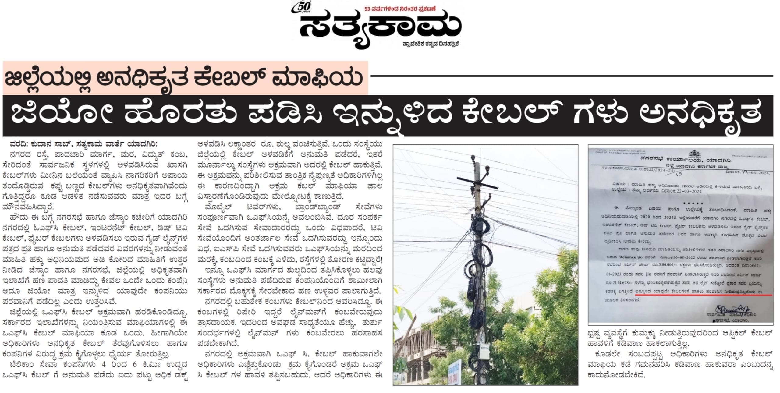 ಜಿಲ್ಲೆಯಲ್ಲಿ ಅನದಿಕೃತ ಕೇಬಲ್ ಗಳ ಹಾವಳಿ ಮಿತಿ ಮೀರಿದ್ದು, ಕಳೆದ ಶನಿವಾರ ಸತ್ಯಕಾಮ ಜಿಲ್ಲೆಯಲ್ಲಿ ಅನಧಿಕೃತ ಕೇಬಲ್ ಮಾಫಿಯಾ. ಜಿಯೋ ಹೊರತುಪಡಿಸಿ ಇನ್ನುಳಿದ ಕೇಬಲ್ ಗಳು ಅನದಿಕೃತವೆಂದು ಸುದ್ದಿ ಪ್ರಕಟಿಸಿತ್ತು. ಸುದ್ದಿ ಪ್ರಕಟವಾಗಿ ನಾಲ್ಕೈದು ಐದು ದಿನ ಕಳೆದರೂ ಕ್ರಮ ಕೈಗೊಳ್ಳಬೇಕಾದ ಜಿಲ್ಲಾಧಿಕಾರಿಯಾಗಲಿ, ನಗರಸಭೆ ಆಯುಕ್ತರಾಗಲಿ(ಪ್ರ), ಜಿಲ್ಲಾ ಉಸ್ತುವಾರಿ ಸಚಿವರಾಗಲಿ ಯಾವುದೇ ಕ್ರಮ ಕೈಗೊಳ್ಳದೇ ಕಣ್ಮುಚ್ಚಿ ಕುಳಿತಿದ್ದಿದ್ದಾರೆ..?