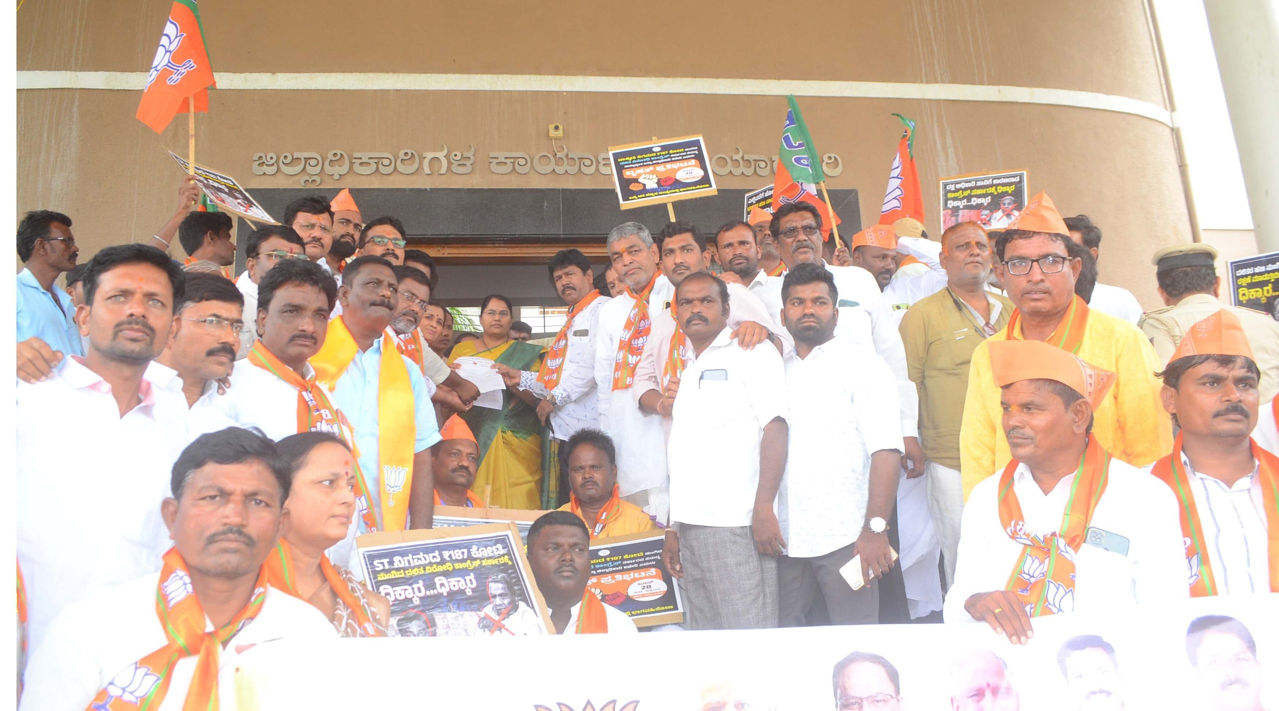 ವಾಲ್ಮೀಕಿ ಅಭಿವೃದ್ದಿ ನಿಗಮದಲ್ಲಿ ನಡೆದ 187 ಕೋಟಿ ರೂ.ಹಗರಣಕ್ಕೆ ಸಂಬಂಧಿಸಿದಂತೆ ಕೂಡಲೇ ಮುಖ್ಯಮಂತ್ರಿ ಸಿದ್ದರಾಮಯ್ಯ ಅವರು ರಾಜೀನಾಮೆ ನೀಡಬೇಕು ಎಂದು ಒತ್ತಾಯಿಸಿ ಬಿಜೆಪಿ ಕಾರ್ಯಕರ್ತರು ಶುಕ್ರವಾರ ಜಿಲ್ಲಾಧಿಕಾರಿ ಕಚೇರಿ ಮುಂಭಾಗ ಬೃಹತ್ ಪ್ರತಿಭಟನೆ ನಡೆಸಿದರು.