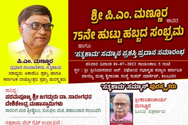 ಕಲಬುರಗಿ :— ಸತ್ಯಕಾಮ ಪತ್ರಿಕೆಯ ಪ್ರಧಾನ ಸಂಪಾದಕರು, ಮಾಧ್ಯಮ ಅಕಾಡೆಮಿ ಪ್ರಶಸ್ತಿ ಹಾಗೂ ಕರ್ನಾಟಕ ರಾಜ್ಯೋತ್ಸವ ಪ್ರಶಸ್ತಿ ಪುರಸ್ಕೃತ ರಾದ ಸನ್ಮಾನ್ಯ ಶ್ರೀ ಪಿ ಎಂ ಮಣ್ಣೂರ ಅವರ 75ನೇ ಹುಟ್ಟು ಹಬ್ಬದ ಭವ್ಯ ಸಮಾರಂಭ ಶ್ರೀ ಶ್ರೀನಿವಾಸರಾವ್ ಆರ್ ರಘೋಜಿ ಸಭಾ ಗ್ರಹ ಕಲ್ಯಾಣ ಕರ್ನಾಟಕ ವಾಣಿಜ್ಯ ಮತ್ತು ಕೈಗಾರಿಕಾ ಸಂಸ್ಥೆ ಸೂಪರ್ ಮಾರ್ಕೆಟ್ ಕಲಬುರಗಿಯಲ್ಲಿ ದಿನಾಂಕ 01-07-2023 ರಂದು ಸಾಯಂಕಾಲ 5-00 ಗಂಟೆಗೆ ವಿಜ್ರಮಣೆಯಿಂದ ಆಚರಿಸಲಾಗುತ್ತಿದೆ ಎಂದು ಸತ್ಯಕಾಮ ಪತ್ರಿಕೆಯ ಕಲಬುರಗಿ ಸ್ಥಾನಿಕ ಸಂಪಾದಕ ಶ್ರೀ ಆನಂದ್ ಮಣ್ಣೂರ ರವರು ತಿಳಿಸಿದ್ದಾರೆ.…