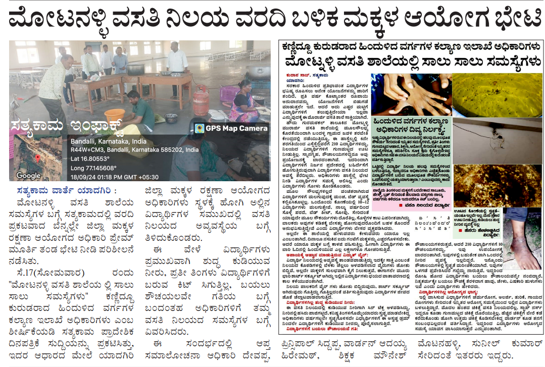 ಸೆ.17(ಸೋಮವಾರ) ರಂದು “ಮೋಟನಳ್ಳಿ ವಸತಿ ಶಾಲೆಯ ಲ್ಲಿ ಸಾಲು ಸಾಲು ಸಮಸ್ಯೆಗಳು” ಕಣ್ಣಿದ್ದೂ ಕುರುಡರಾದ ಹಿಂದುಳಿದ ವರ್ಗಗಳ ಕಲ್ಯಾಣ ಇಲಾಖೆ ಅಧಿಕಾರಿಗಳು ಎಂಬ ಶೀರ್ಷಿಕೆಯಡಿ ಸತ್ಯಕಾಮ ಪ್ರಾದೇಶಿಕ ದಿನಪತ್ರಿಕೆ ಸುದ್ದಿಯನ್ನು ಪ್ರಕಟಿಸಿತ್ತು, ಇದರ ಆಧಾರದ ಮೇಲೆ ಯಾದಗಿರಿ ಜಿಲ್ಲಾ ಮಕ್ಕಳ ರಕ್ಷಣಾ ಆಯೋಗದ ಅಧಿಕಾರಿಗಳು ಸ್ಥಳಕ್ಕೆ ಹೋಗಿ ಅಲ್ಲಿನ ವಿದ್ಯಾರ್ಥಿಗಳ ಸಮುಖದಲ್ಲಿ ವಸತಿ ನಿಲಯದ ಅವ್ಯವಸ್ಥೆಯ ಬಗ್ಗೆ ತಿಳಿದುಕೊಂಡರು.