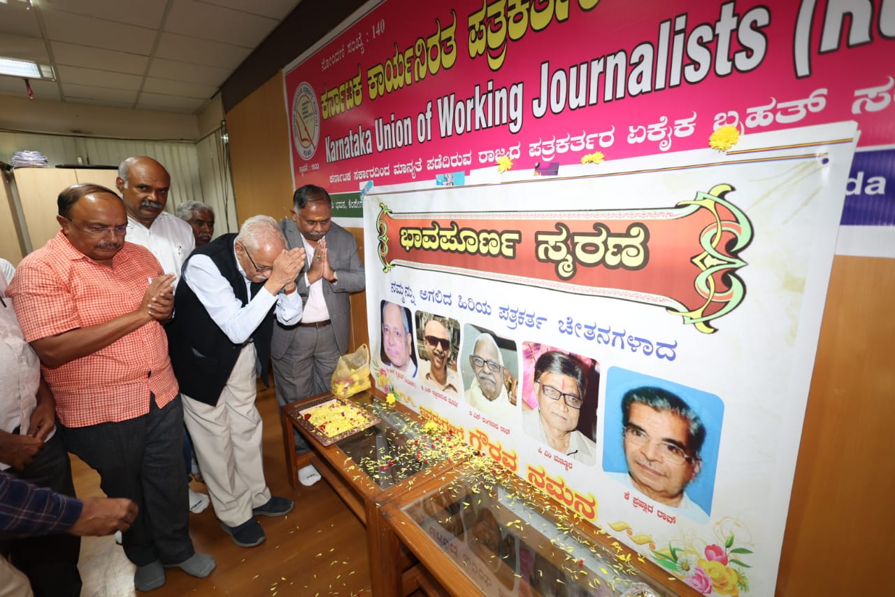 ಬೆಂಗಳೂರು: ಸುದ್ದಿ ಮನೆಯಲ್ಲಿ ಸುದೀರ್ಘ ಅವಧಿಗೆ ಪತ್ರಕರ್ತರಾಗಿ ಸೇವೆ ಸಲ್ಲಿಸಿ ಅಗಲಿದ ಸಿ.ಆರ್.ಕೃಷ್ಣರಾವ್, ಕೆ.ಎಸ್.ಸಚ್ಚಿದಾನಂದ ಮೂರ್ತಿ, ಜಿ.ಎನ್.ರಂಗನಾಥ ರಾವ್, ಪಿ.ಎಂ.ಮಣ್ಣೂರ, ಕೆ.ಪ್ರಹ್ಲಾದರಾವ್ , ಗುಡಿಬಂಡೆ ನರಸಿಂಹಮೂರ್ತಿ, ಟಿ.ಎಸ್.ರಾಜಾರಾವ್ ಅವರುಗಳಿಗೆ ಕರ್ನಾಟಕ ಕಾರ್ಯ ನಿರತ ಪತ್ರಕರ್ತರ ಸಂಘ (ಕೆಯುಡಬ್ಲ್ಯೂಜೆ) ನುಡಿ ನಮನ ಸಲ್ಲಿಸಿ, ಅವರೆಲ್ಲರ ಭಾವಚಿತ್ರಕ್ಕೆ ಪುಷ್ಪನಮನ ಸಲ್ಲಿಸಲಾಯಿತು.