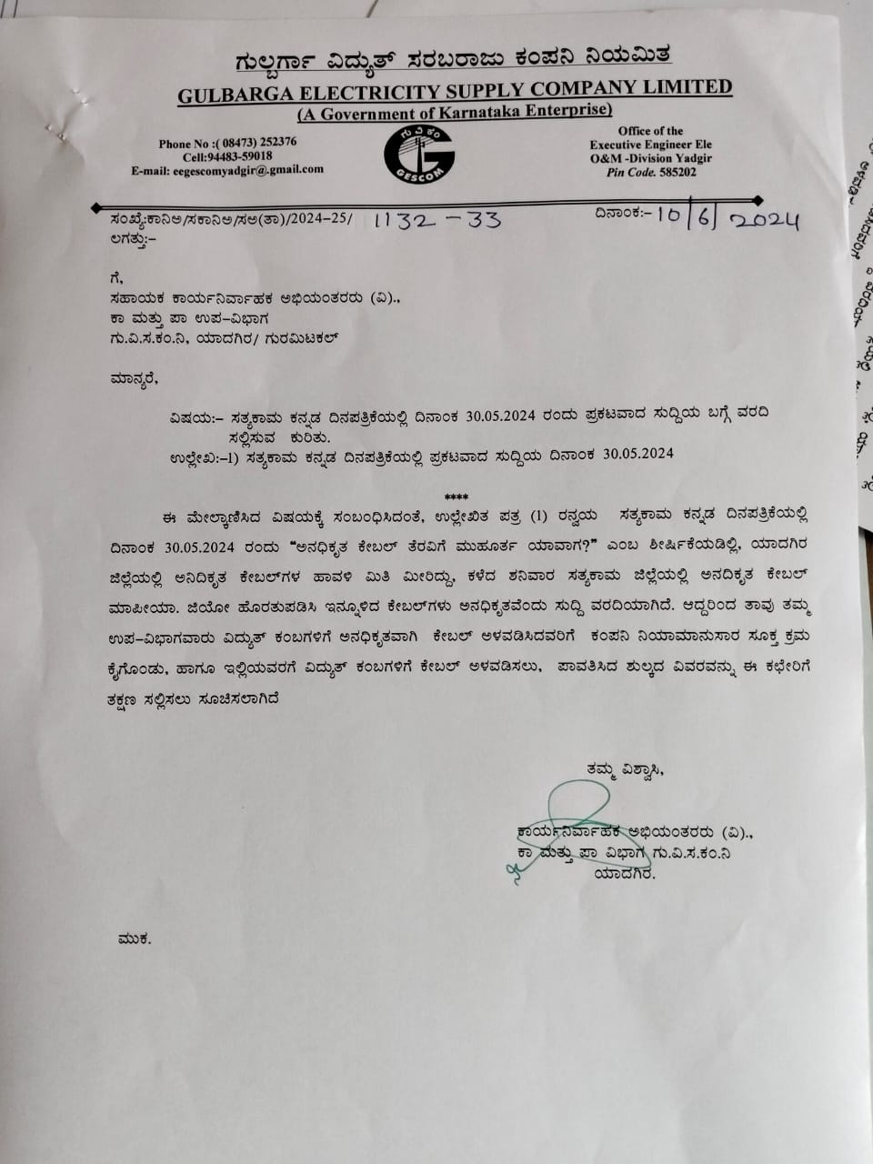 ಕಲಬುರ್ಗಿ: ಇತ್ತೀಚೆಗೆ ಕಳೆದ ತಿಂಗಳು ದಿನಾಂಕ 30 ರಂದು ನಮ್ಮ ಪತ್ರಿಕೆಯಲ್ಲಿ ಅನಧಿಕೃತ ಕೇಬಲ್ ತೆರವು ಯಾವಾಗ ಎಂಬ ವರದಿಗೆ ಇಂದು ಮುಹೂರ್ತ ಬಂದಿದೆ ಜೆಸ್ಕಾಂ ಕಾರ್ಯನಿರ್ವಾಹಕ ಅಭಿಯಂತರರು ಯಾದಗಿರಿ ಅವರು ಜಿಲ್ಲೆಯಲ್ಲಿ ಅನಧಿಕೃತ ಕೇಬಲ್ ಮಾಫಿಯಾ ಜಿಯೋ ಹೊರತುಪಡಿಸಿ ಇನ್ನುಳಿದ ಕೇಬಲ್ ಗಳು ಅನಧಿಕೃತ ಎಂದು ತಮ್ಮ ಉಪ ವಿಭಾಗವಾರು ವಿದ್ಯುತ್ ಕಂಬಗಳಿಗೆ ಅನಧಿಕೃತವಾಗಿ ಕೇಬಲ್ ಅಳವಡಿಸಿದವರಿಗೆ ಕಂಪನಿ ನಿಯಮ ಸಂಸಾರ ಸೂಕ್ತ ಕ್ರಮ ಕೈಗೊಂಡು ಹಾಗೂ ಇಲ್ಲಿವರೆಗೆ ವಿದ್ಯುತ್ ಕಂಬಗಳಿಗೆ ಕೇಬಲ್ ಅಳವಡಿಸಲು ಪಾವತಿಸಿದ ಶುಲ್ಕವನ್ನು ಮತ್ತು ಶುಲ್ಕದ ವಿವರ ತಮ್ಮ ಕಚೇರಿಗೆ ತಕ್ಷಣ ಸಲ್ಲಿಸಲು ಸೂಚಿಸುತ್ತಾರೆ.