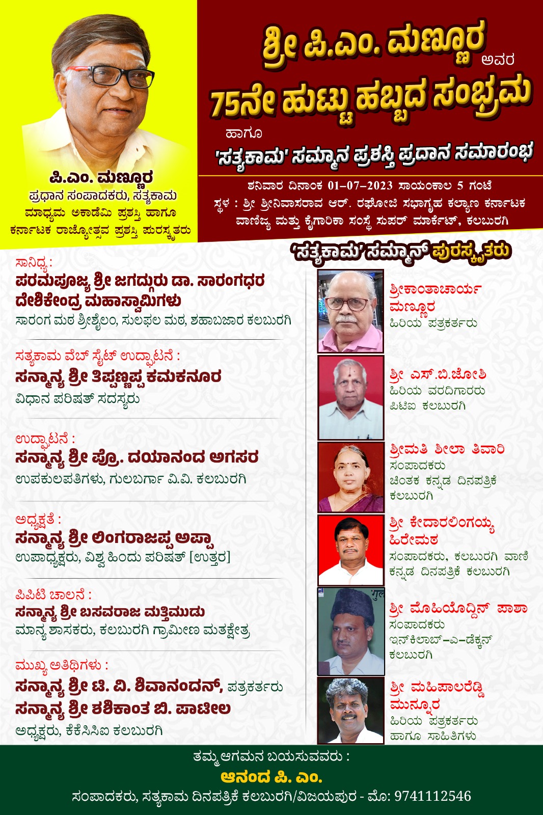 ಕಲಬುರಗಿ :— ಸತ್ಯಕಾಮ ಪತ್ರಿಕೆಯ ಪ್ರಧಾನ ಸಂಪಾದಕರು, ಮಾಧ್ಯಮ ಅಕಾಡೆಮಿ ಪ್ರಶಸ್ತಿ ಹಾಗೂ ಕರ್ನಾಟಕ ರಾಜ್ಯೋತ್ಸವ ಪ್ರಶಸ್ತಿ ಪುರಸ್ಕೃತ ರಾದ ಸನ್ಮಾನ್ಯ ಶ್ರೀ ಪಿ ಎಂ ಮಣ್ಣೂರ ಅವರ 75ನೇ ಹುಟ್ಟು ಹಬ್ಬದ ಭವ್ಯ ಸಮಾರಂಭ ಶ್ರೀ ಶ್ರೀನಿವಾಸರಾವ್ ಆರ್ ರಘೋಜಿ ಸಭಾ ಗ್ರಹ ಕಲ್ಯಾಣ ಕರ್ನಾಟಕ ವಾಣಿಜ್ಯ ಮತ್ತು ಕೈಗಾರಿಕಾ ಸಂಸ್ಥೆ ಸೂಪರ್ ಮಾರ್ಕೆಟ್ ಕಲಬುರಗಿಯಲ್ಲಿ ದಿನಾಂಕ 01-07-2023 ರಂದು ಸಾಯಂಕಾಲ 5-00 ಗಂಟೆಗೆ ವಿಜ್ರಮಣೆಯಿಂದ ಆಚರಿಸಲಾಗುತ್ತಿದೆ ಎಂದು ಸತ್ಯಕಾಮ ಪತ್ರಿಕೆಯ ಕಲಬುರಗಿ ಸ್ಥಾನಿಕ ಸಂಪಾದಕ ಶ್ರೀ ಆನಂದ್ ಮಣ್ಣೂರ ರವರು ತಿಳಿಸಿದ್ದಾರೆ.